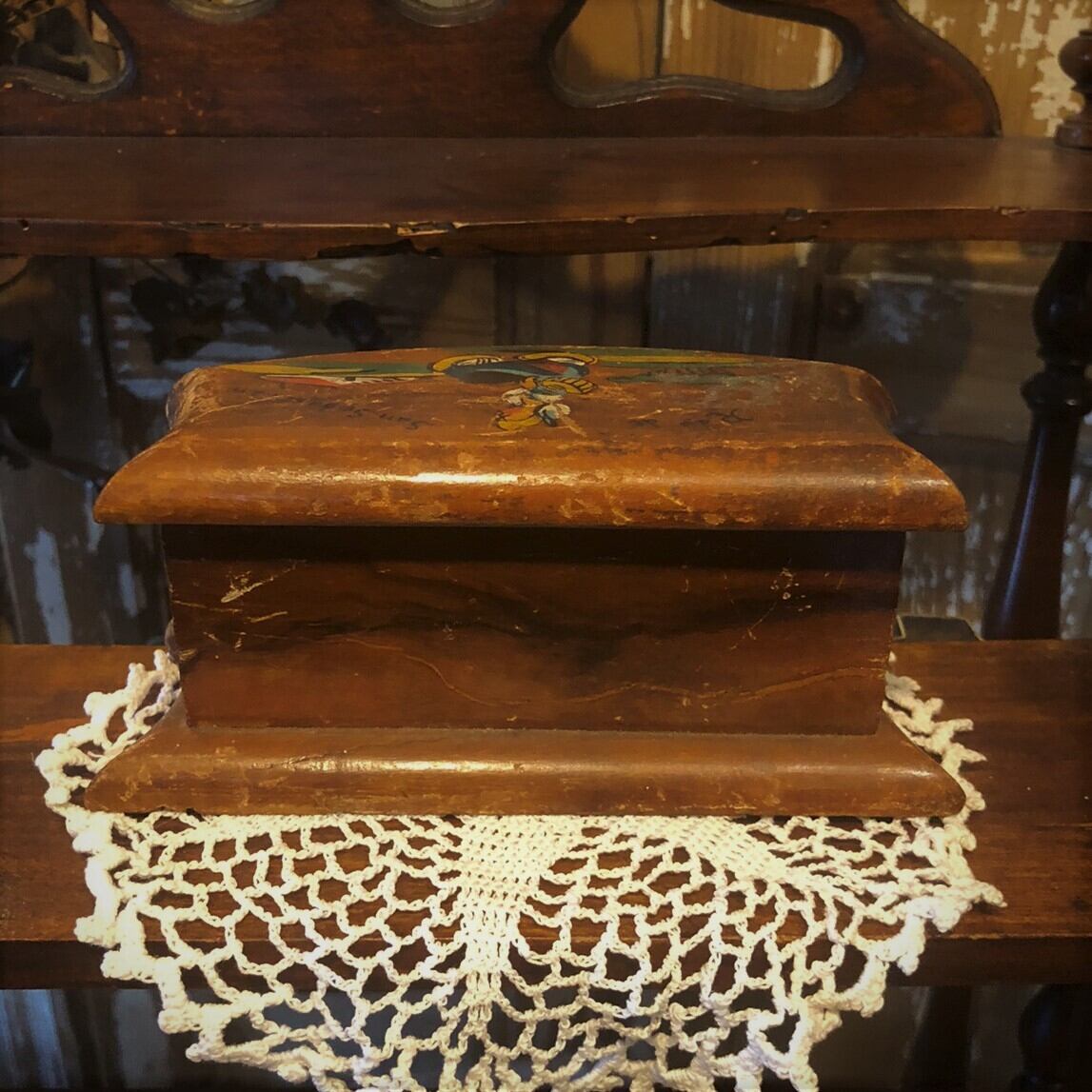 とてもかわいい女の子の絵が手書きされた木製の小物入れになります。