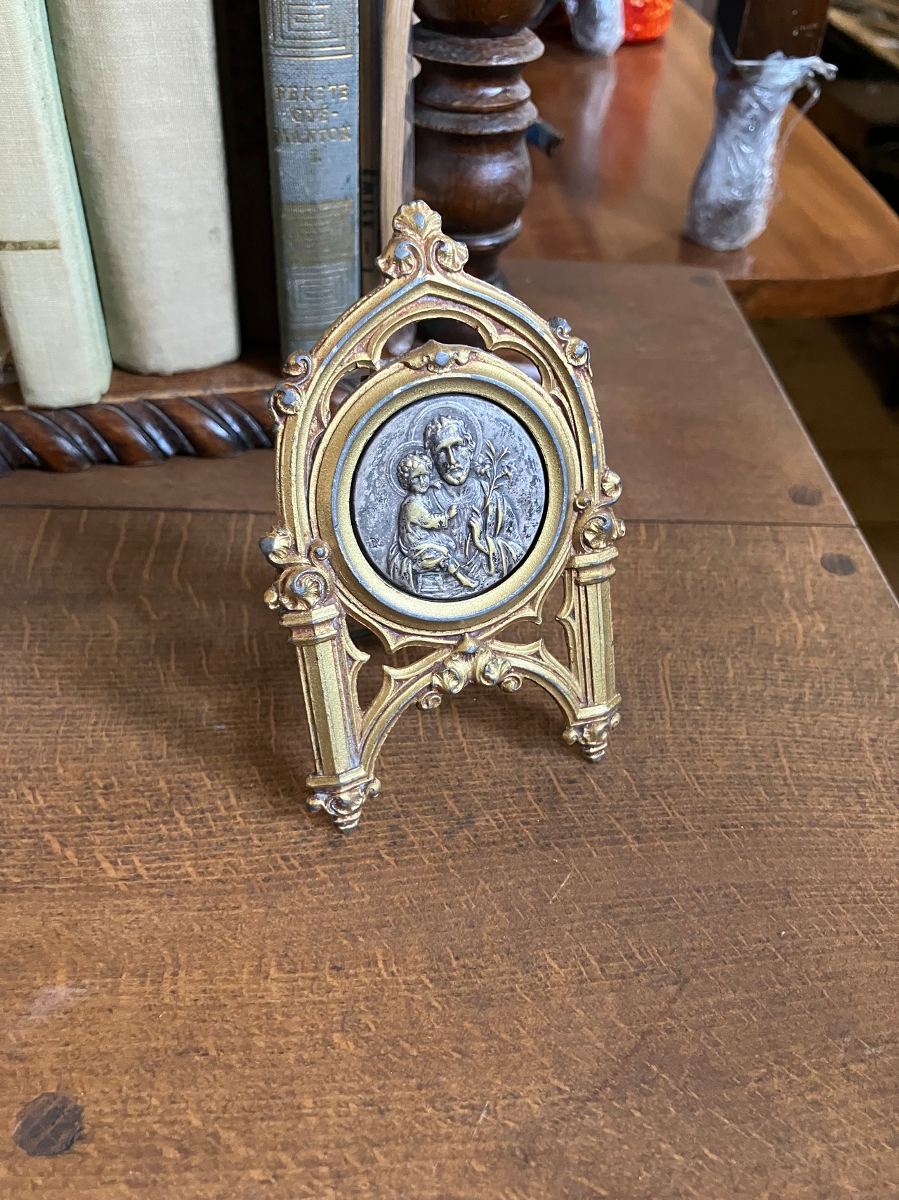 所々擦れて地の色が見えていますので真鍮製ではなくピューターなどの金属に真鍮ぽい塗装がされているのだと思います。